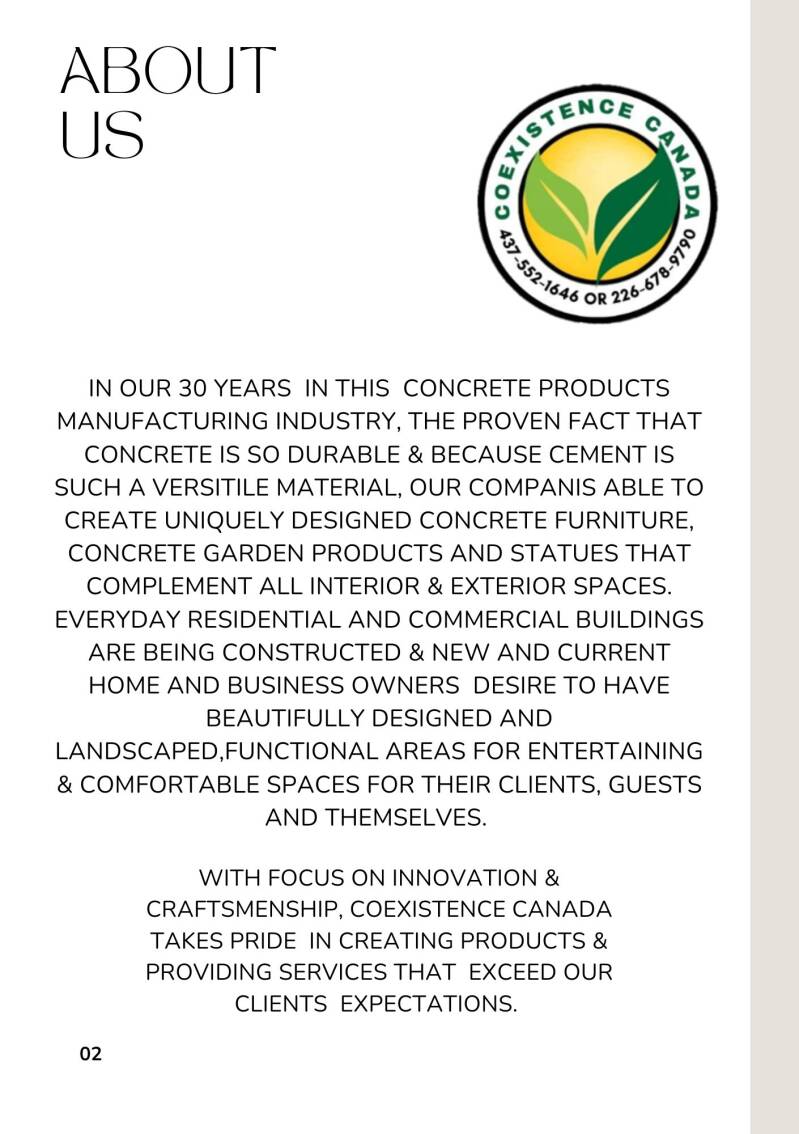 Coexistence Canada's goal is to become the leading manufacturer and provider of concrete furniture, stone products and concrete lawn and garden products in Calgary Alberta ,Edmonton and eventually establish locations in all northern provinces in Canada
